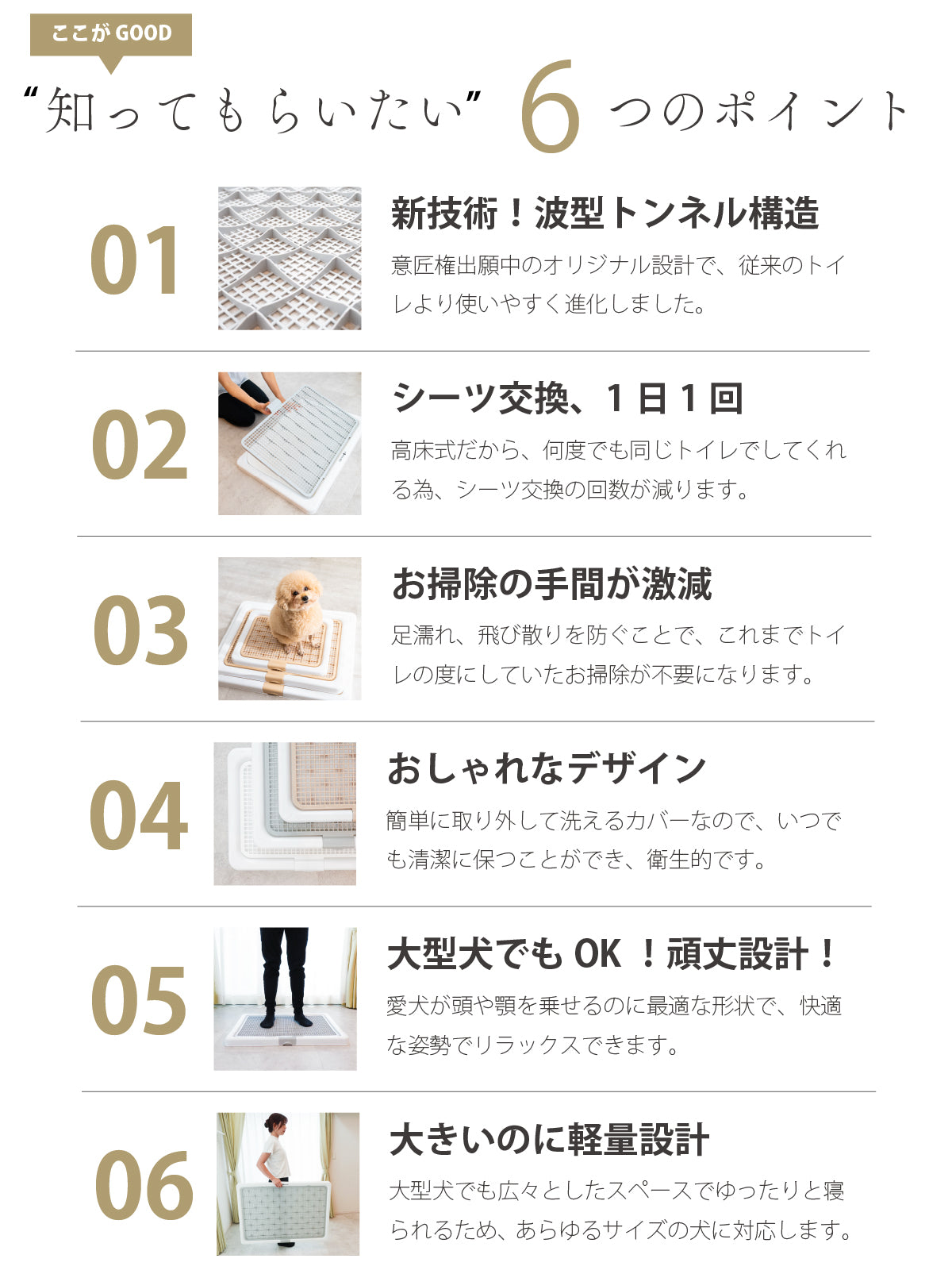 | 大判で大型犬や多頭買いにとっても最適!高床式で足元いつでも綺麗なだけでなく、綺麗好きなワンちゃんも、気にせずしてくれます。 |